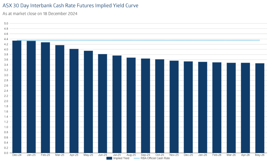 This is key – its 2024 cautious approach is seeing a 2025 pivotal shift and the board is now making it clear that its focus of managing inflation risks is starting to switch to addressing growth concerns. Market forecasting has easing beginning at the April meeting, the range from economists is February through to May 2025. Whenever it starts, the consensus between the market and the theoretical world is the same – one cut will bring several and come December 2025 the belief is the cash rate will be as low as 3.6%.
