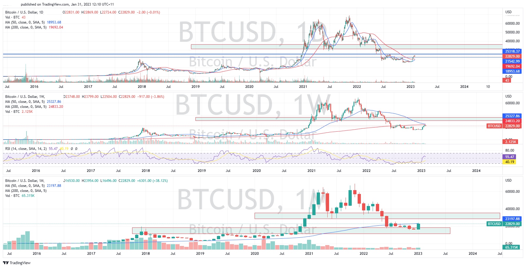 Risk assets have been the play in early 2023 with hopes for a settling of interest rate hikes by major central banks. As the technology sector and other growth areas have continued to rise up the price of Bitcoin has followed. The price is almost 50% up from its lows in the middle of December 2022. With the macroeconomic factors still largely the main drivers of the risk sentiment and the upcoming Federal Reserve Funds to be announced on Thursday, the rate announcement could play a large role in the short term price action. The Fed is expected to increase the official rate by 25 bps. However, all eyes will be on the accompanying commentary that will provide important direction on the Fed’s future plans in the upcoming months. Moreover, a hawkish commentary will likely lead to a selloff in risk assets and dovish commentary the opposite.