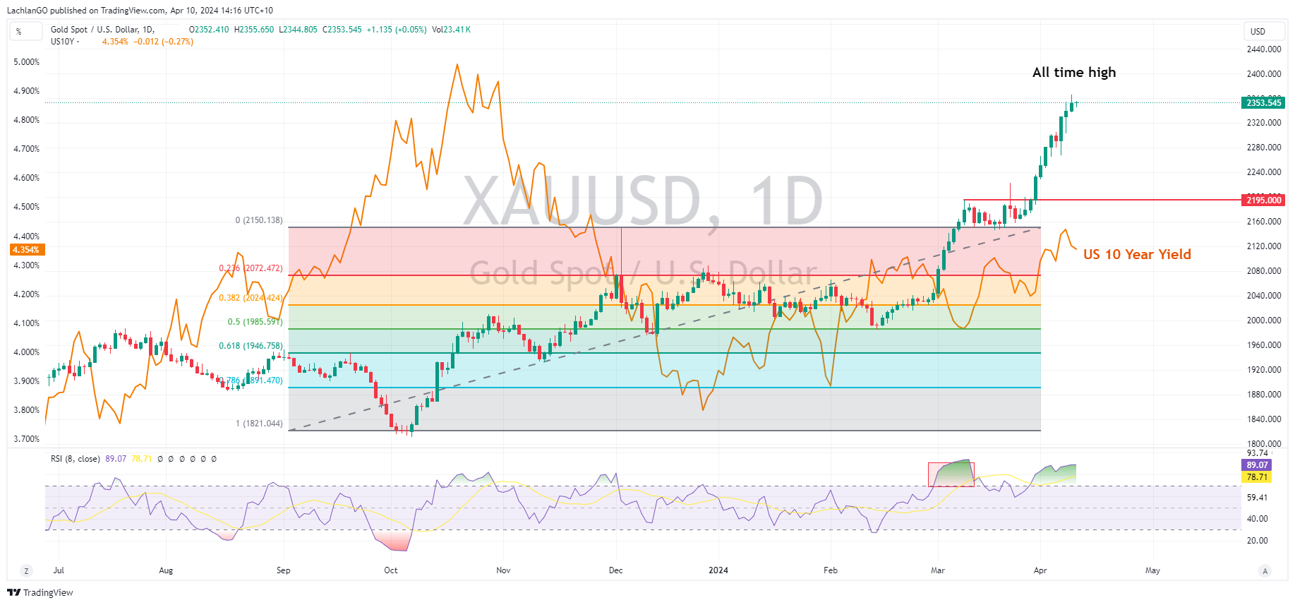 USD has been in a holding pattern during April with the US dollar Index range trading between the support at 104 and resistance at 105, the 104 support is certainly in play should a cooler than expected CPI reading come in, with the next support at the 200-day SMA at 103.81