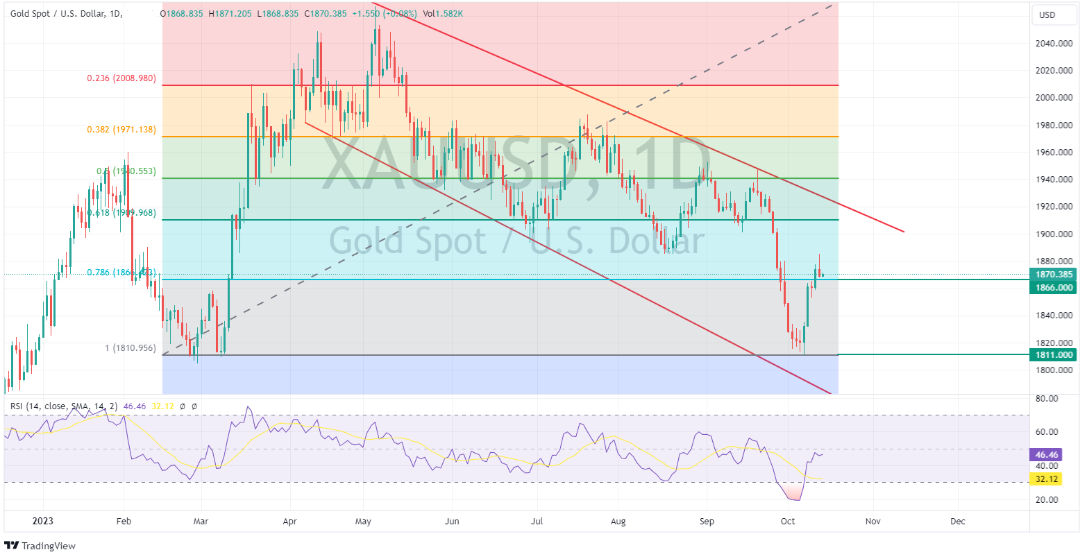 Gold finished the session down but considering USD strength and surging yields held up admirably as haven flows helped lessen the damage. XAUUSD also finding some support at the 78.6 Fib level at 1866.