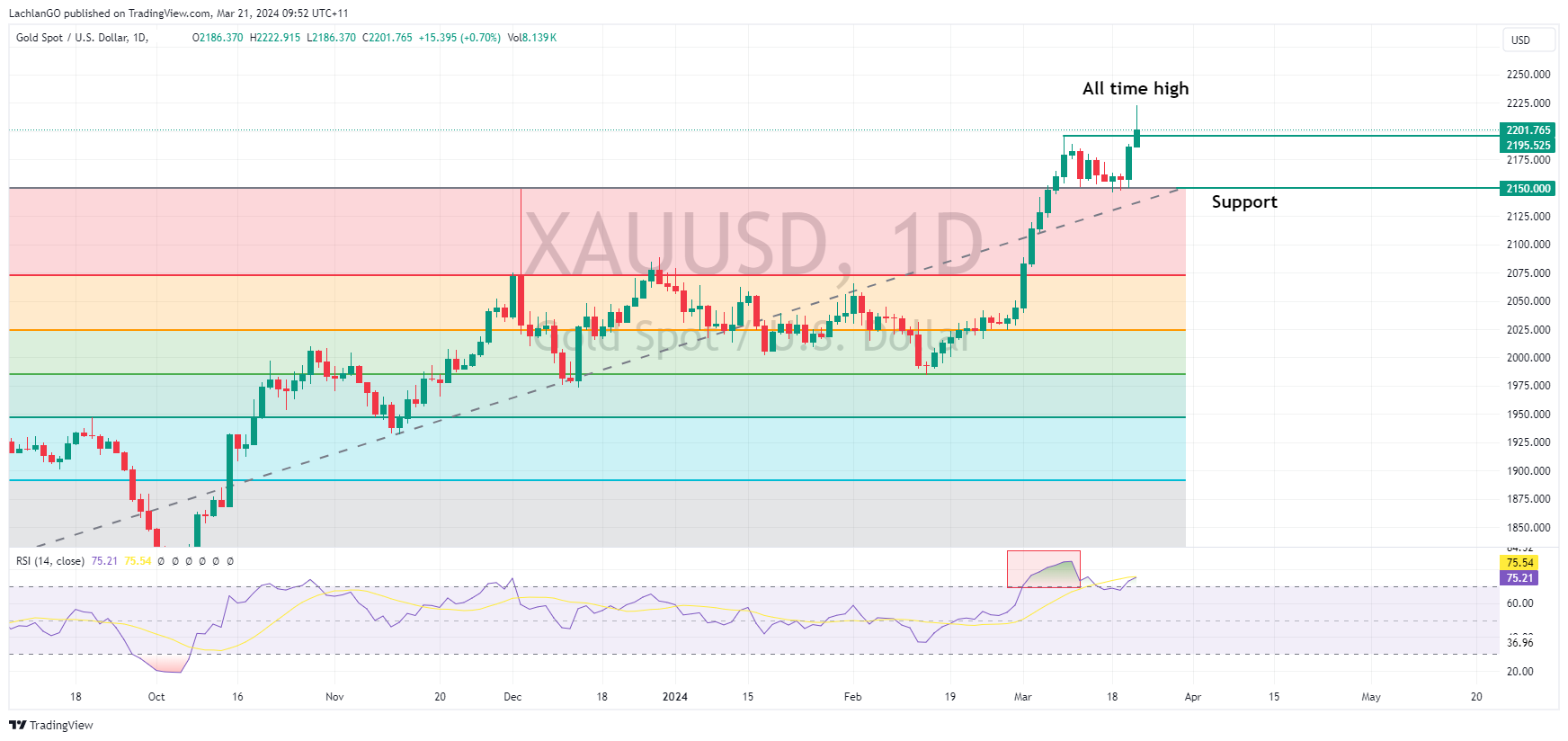 Gold ripped to all time highs, with XAUUSD hitting a high of 2222 USD an ounce on the back of USD weakness and falling yields post FOMC, before falling back just above the old high at 2195 heading into the APAC session.