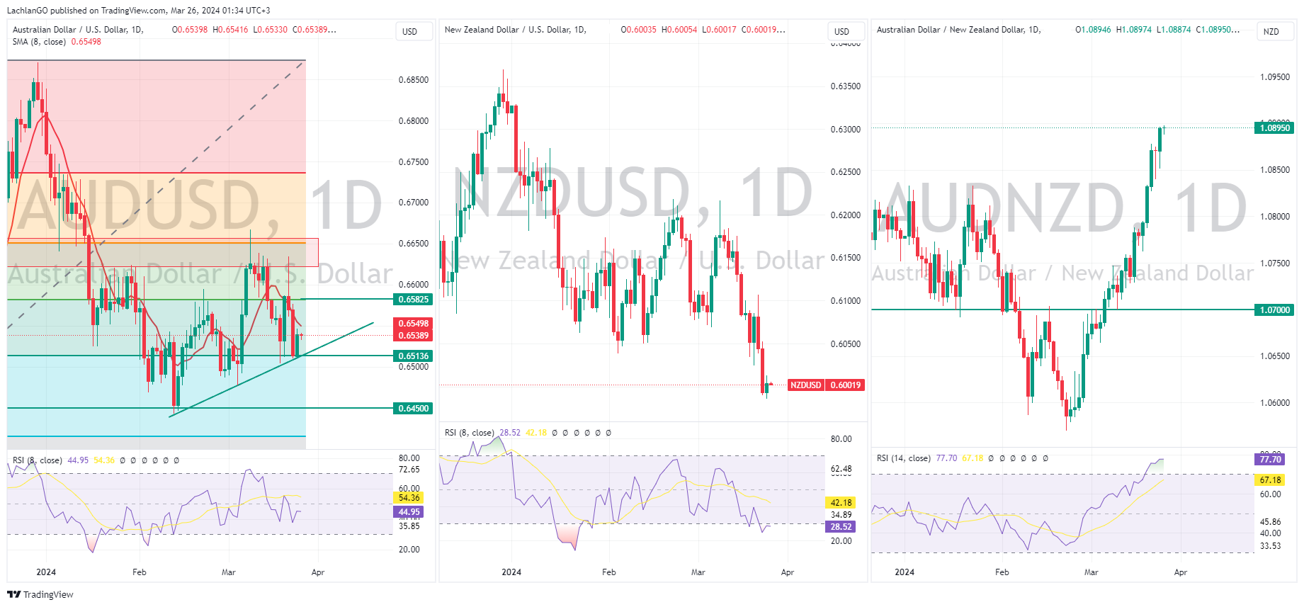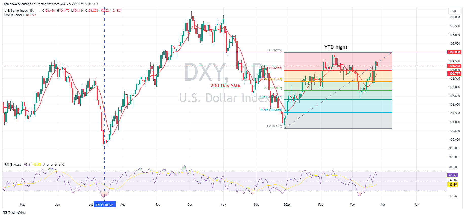 26 March 2024 By Lachlan MeakinUSD was slightly lower on Monday with DXY hitting a low of 104.140, holding above the 104 support level. News was light with only New Home Sales of any note, which missed modestly to the downside (662k vs the expected 675k). There was some Fed speak, the highlight being Fed hawk Bostic where he reiterated his desire of just one rate cut in 2024, this failed to make much impact on the Dollar though.