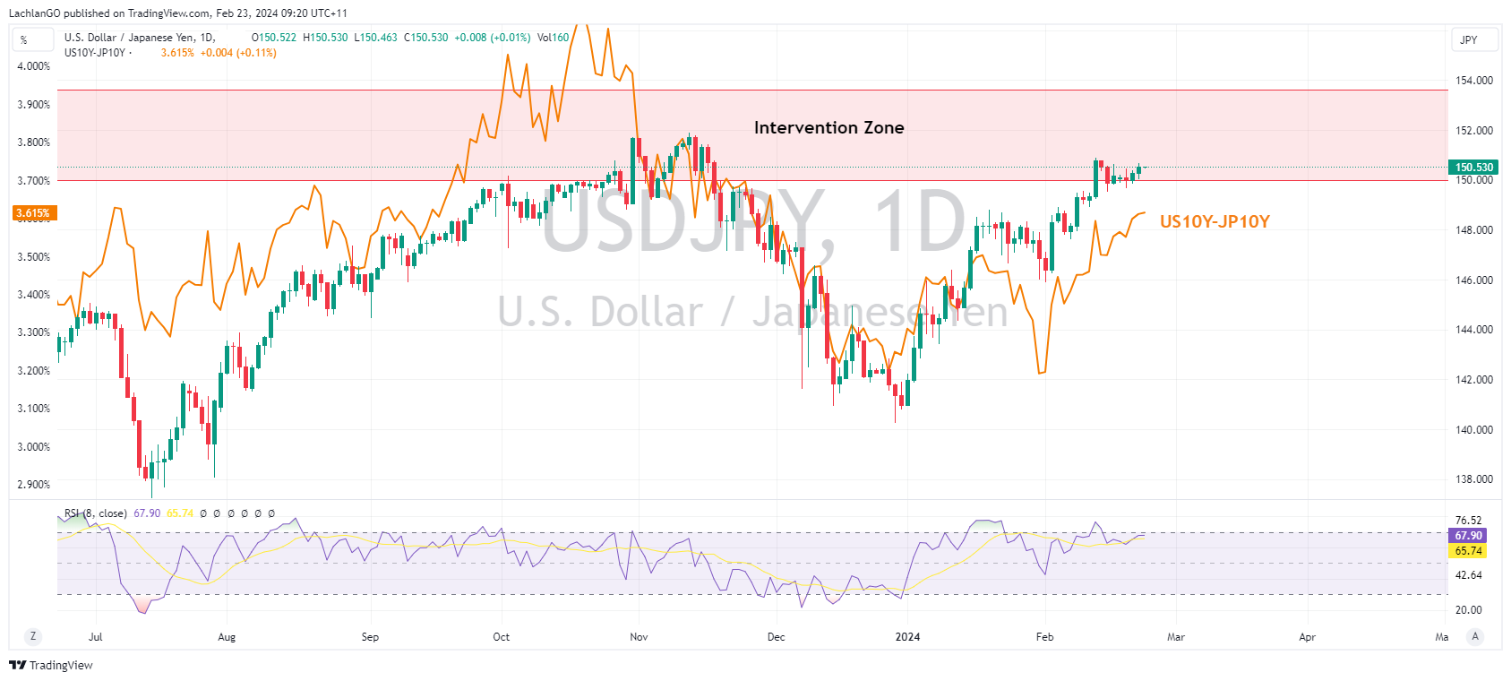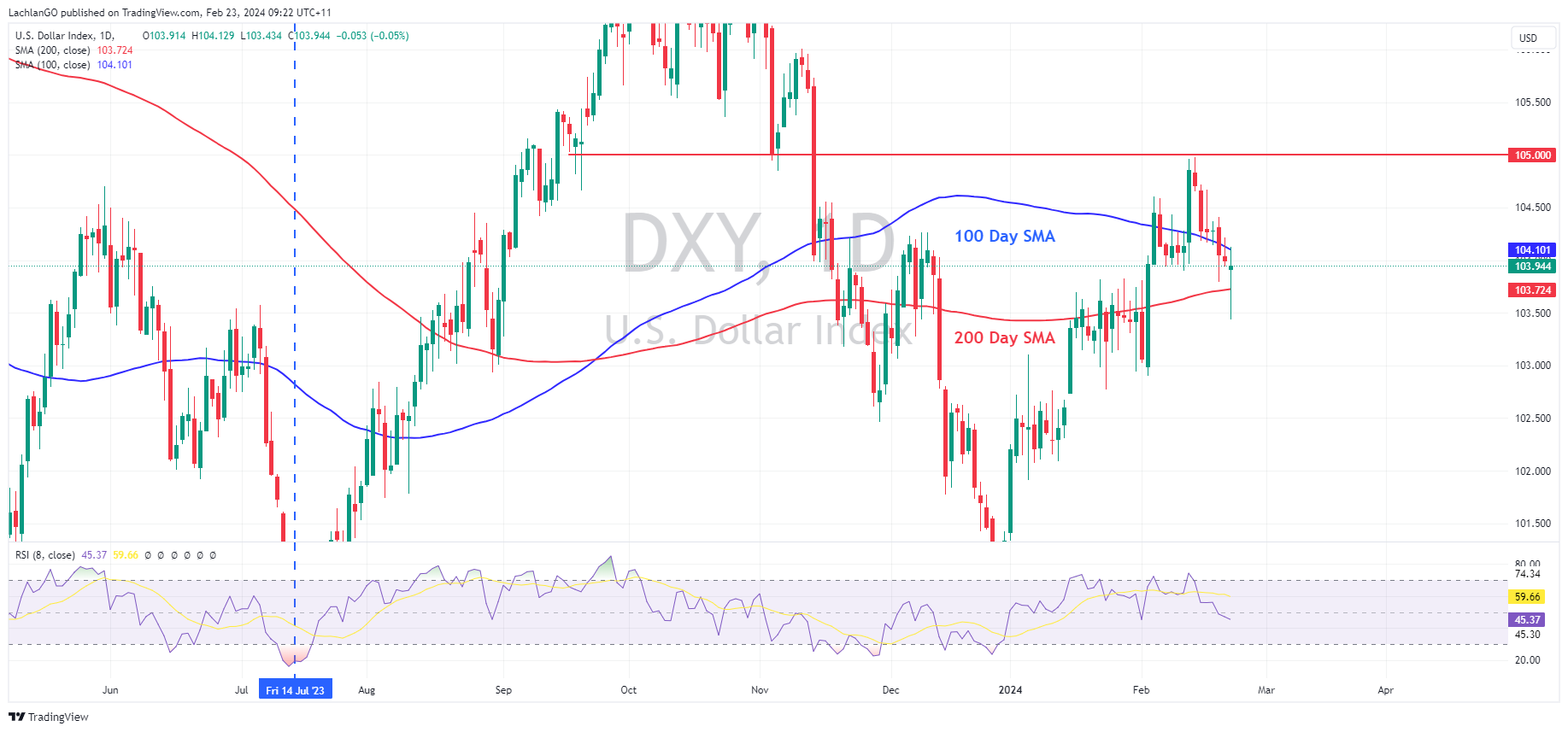 23 February 2024 By Lachlan MeakinUSD was ultimately flat in Thursdays session after a rollercoaster of a ride, DXY printed a low in the European session of 103.43 before rallying up to the 100 Day SMA at 104.10 after better than expected US Jobless claims. Flash PMIs for February were mixed with a fall in Services but a rise in Manufacturing, DXY heading into the APAC session just below the 104 level.