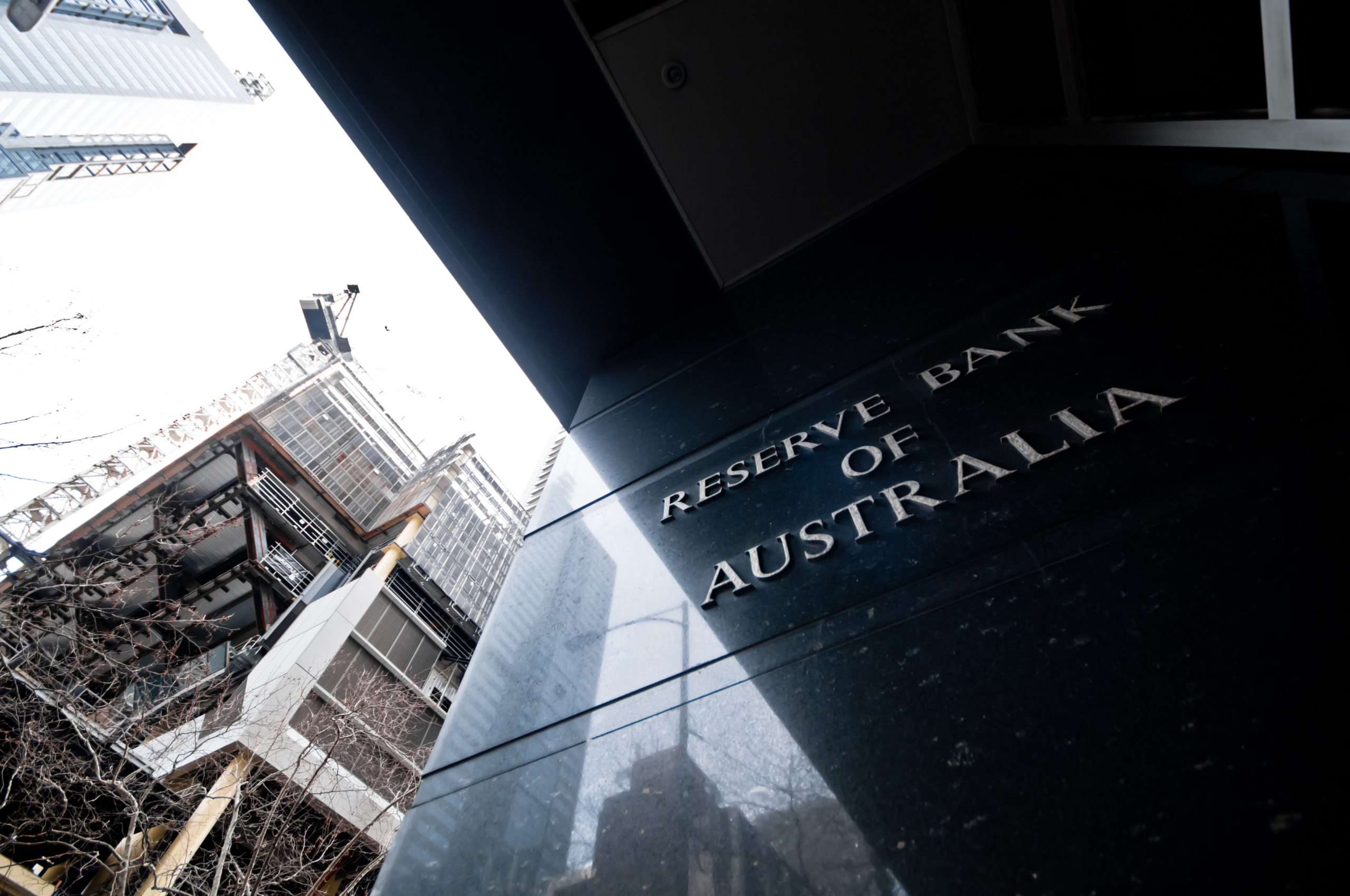 MELBOURNE, AUSTRALIA – JULY 26, 2018: Reserve Bank of Australia name on black granite wall in Melbourne Australia with a reflection of high-rise buildings. The RBA building is located at 60 Collins St, Melbourne VIC 3000 Australia. Ready to start trading?