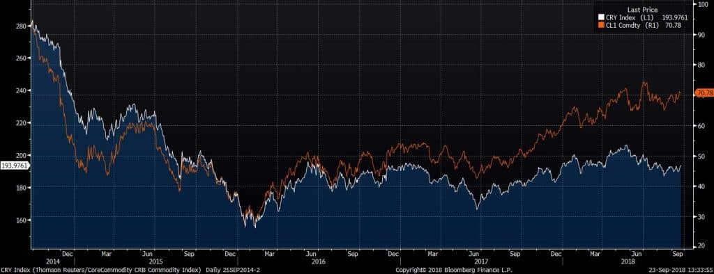 Thompson Reutters Core Commodity Index (White line) Vs WTI Oil (Orange Line)