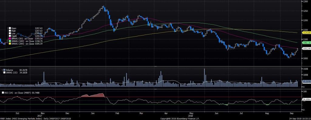 Emerging markets, along with most risk assets, have recovered somewhat over the past couple of weeks. However, we believe this recovery is mainly due to profit taking as opposed to a change of fundamentals. For the trend to reverse, we want to see the EM index to stabilise above 1100.