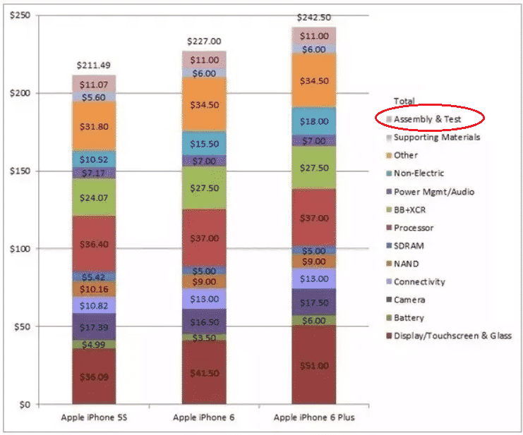 For example, in the case of producing an iPhone, Chinese factories contribute only 6% of the components (which is Assembly). All the other significant parts such as Hardware, Touchscreen& Glass, Battery, etc. these typically come from other countries such as South Korea and Japan.