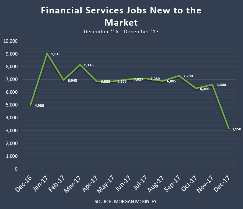 Morgan McKinley has shown that the number of jobs available in December 2017 fell by around 52% month-to-month, a much bigger decline compared to the 30% drop seen over the same periods in 2015 and 2016. “In December, the city is abuzz with holiday parties, not hiring, so a drop is to be expected, but for it to be such a seismic drop is alarming” said Hakan Enver, the operations director for financial services for Morgan McKinley.