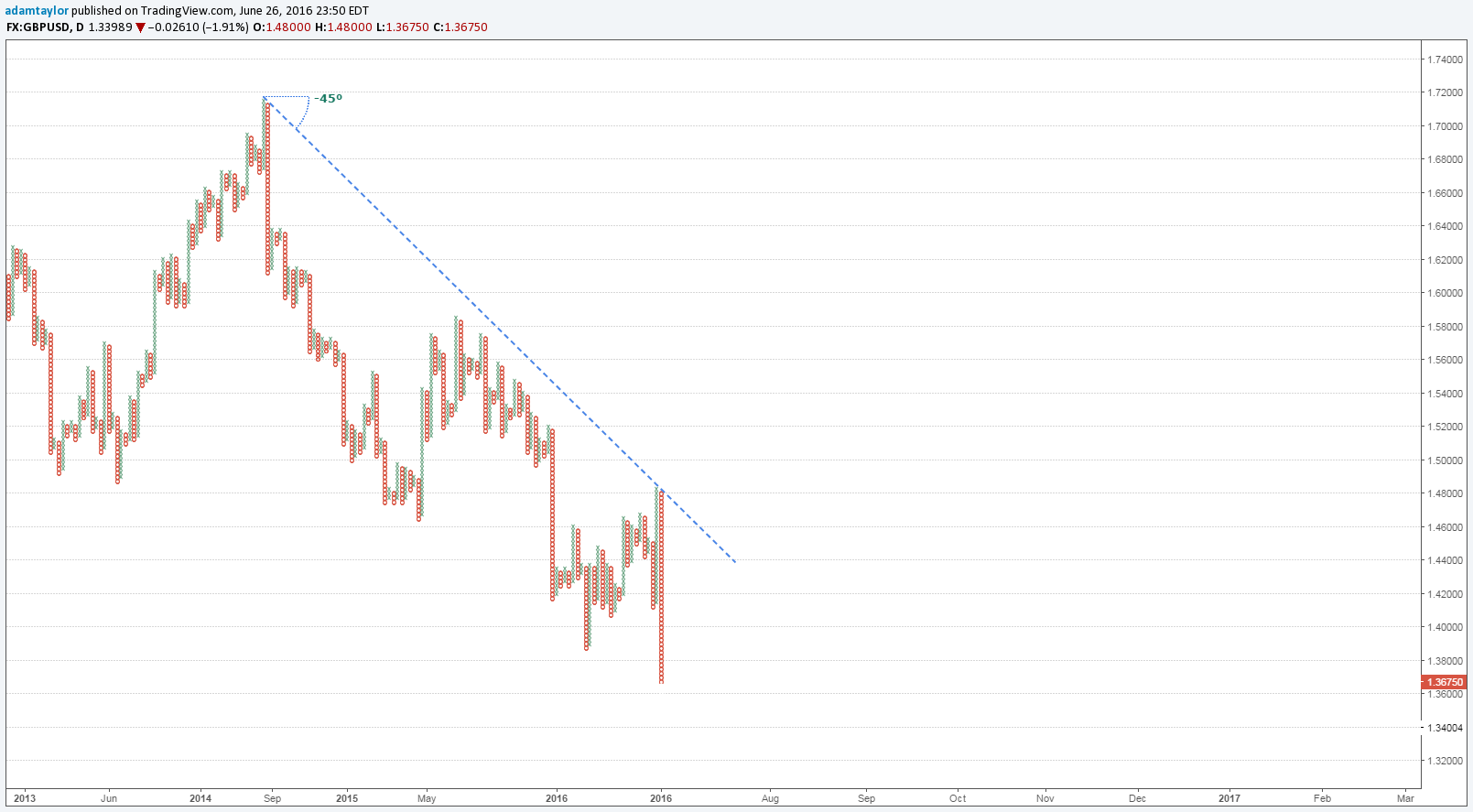 Difficult to assess prices at a new 30 year lowWe saw an incredible 10% move from a high of 1.5017 down to a 30 year low of 1.3227. At this point, it becomes extremely difficult to assess when you have relatively little price action to compare it with.