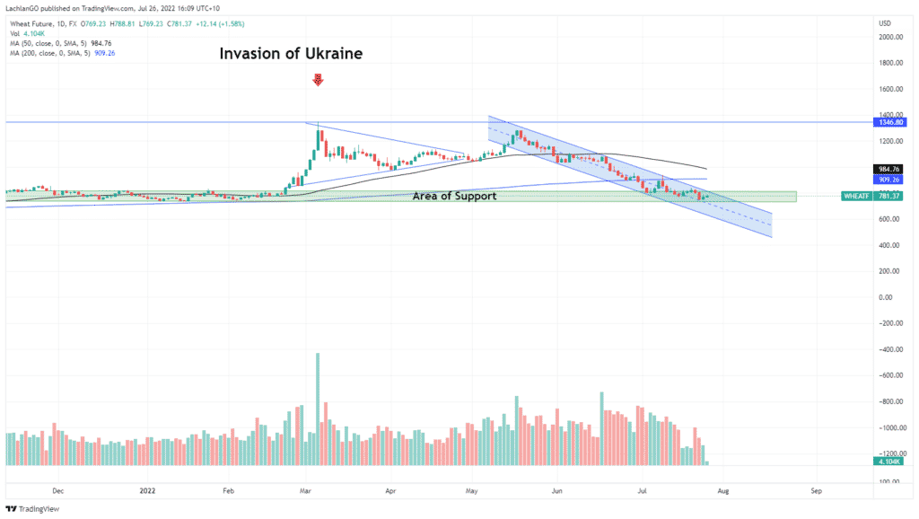 The price chart of wheat tells an important story. It can be observed that the wheat futures initially spiked at the beginning of the war in Ukraine as the market reacted to the initial supply shock. The price then moved into a tight consolidation tightly before breaking out towards the highs. However, this breakout failed, and was unable to rise above the key resistance level at $1354. The price of wheat then entered a downward trending channel where it currently remains.
