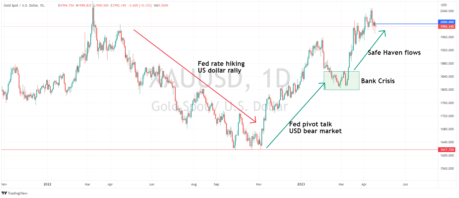 20 April 2023 By Lachlan MeakinGold has been one of the most popular and highly traded markets recently as price action in the precious metal has really come alive, rate hikes, the war in Ukraine and Bank Crises have all played a part in the fundamental reasons for gold price movements in the last 12 months. Let’s take a look at the chart to see these fundamental effects and how the technical are shaping up.