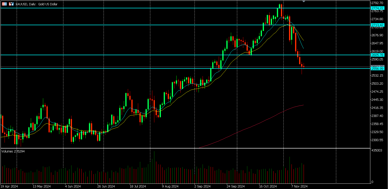 Gold hit record highs, reaching almost 2800 on 30th October. An expected profit-taking retracement at the turn of the month soon turned into a reversal, as USD strength continued, and the price dropped through 2700 then 2600 before coming to rest and pause at a 2-month low and what could turn into a support level at 2550 on Friday.