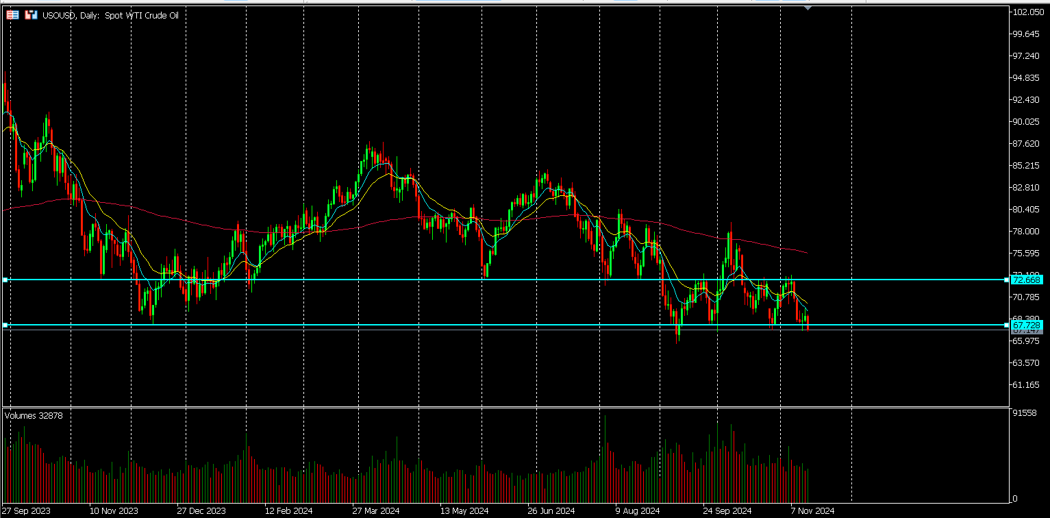 Friday’s close price on the WTI futures contract fell slightly below lows last hit the end of October and September respectively at $67.14, and recording a 7% drop for the week.