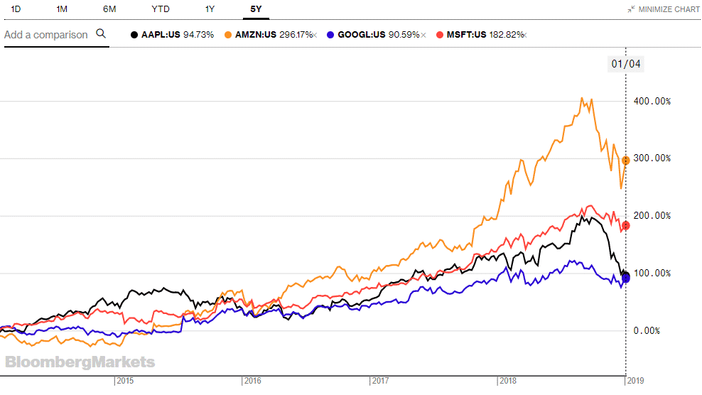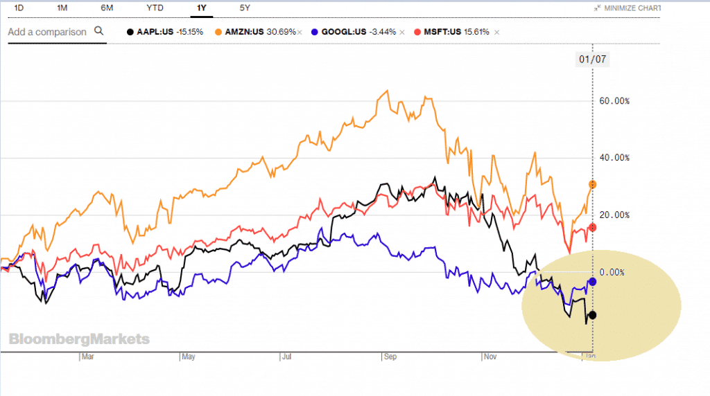Apple, Amazon, Google and Microsoft had been trading on a clear uptrend chart in the past decade, but 2018 took them all on a bumpy ride. The below charts depicts the performance of the four tech giants: