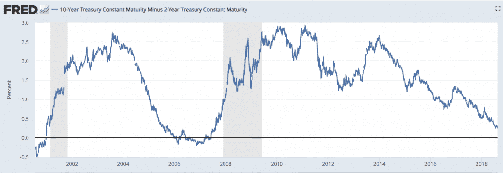 From the chart below, we can see that the current yield spread is heading towards zero. Since the Fed is guaranteed to have four rate hikes in 2018, and more increases are foreseeable in 2019, the spread is very likely to go negative sooner or later.