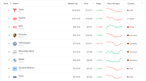 Company PE Ratio BMW 3.11 Volkswagen 4.14 Toyota 9.19 Ford 5.70 Tesla 31.3