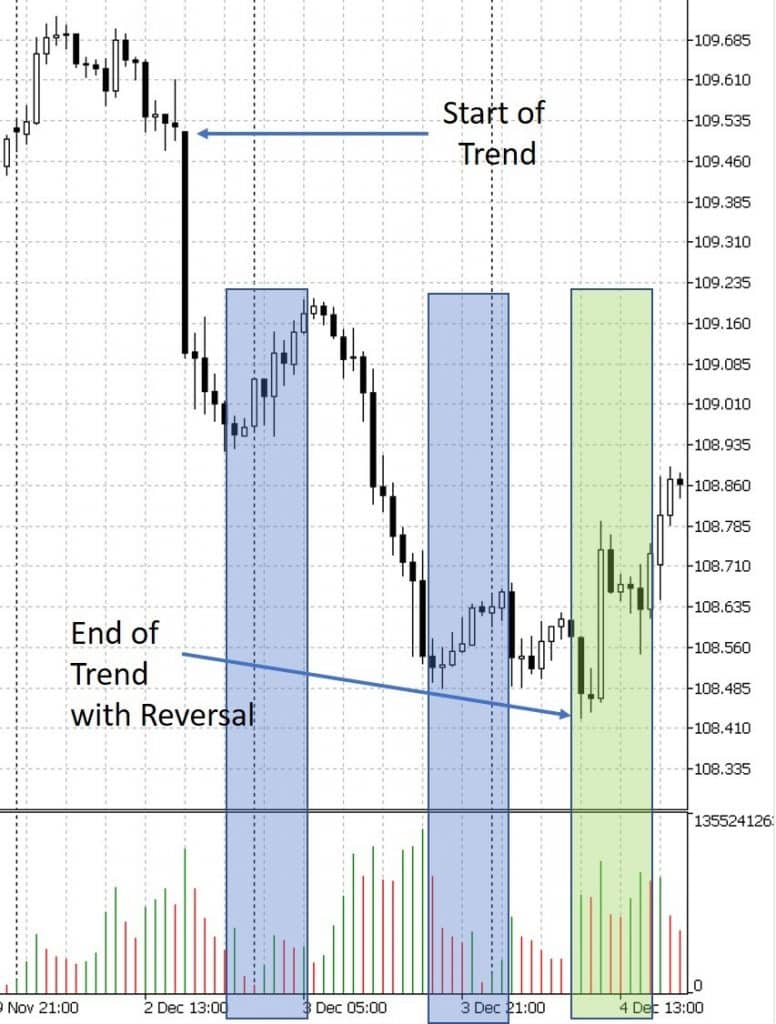 See below for an hourly chart of USDJPY. We have labelled the confirmed start of trend after a double top type of chart pattern through to the end of the trend and subsequent reversal.
