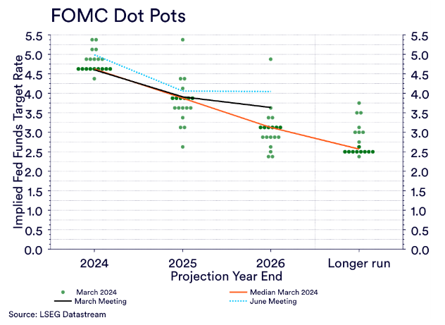 This is pretty clearly reflected in the latest Dot Plot, which is now signalling only cut in 2024 down from 3 at the March meeting. We have highlighted that in the orange and blue lines that shows the marked difference between the two.