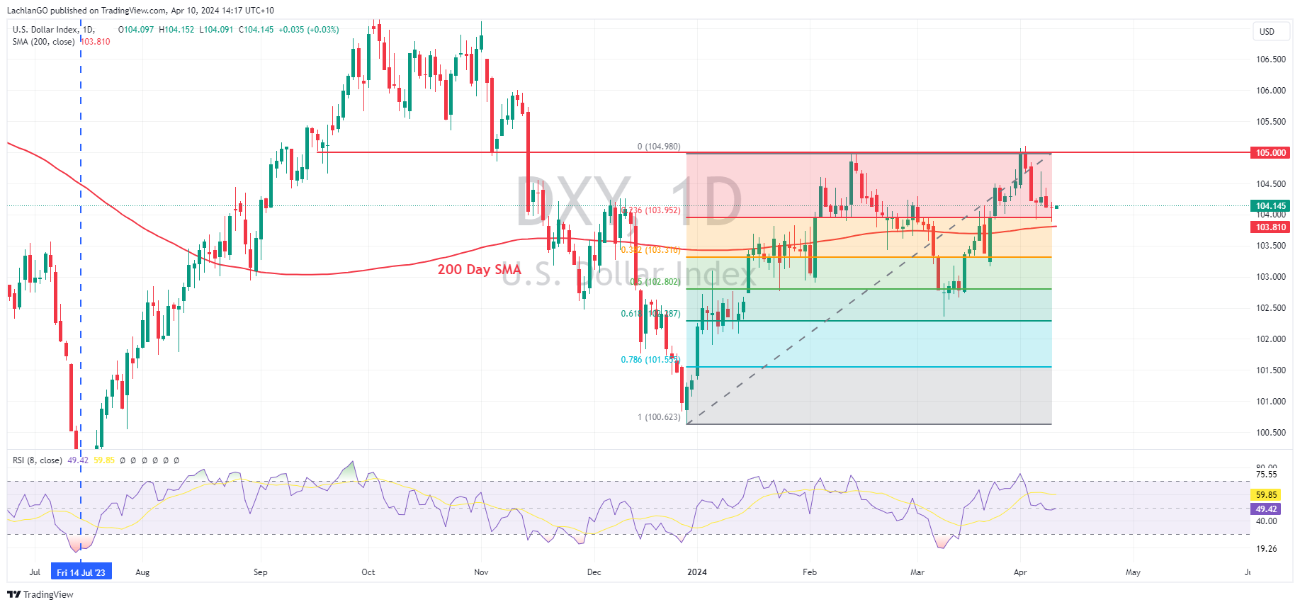USD has been in a holding pattern during April with the US dollar Index range trading between the support at 104 and resistance at 105, the 104 support is certainly in play should a cooler than expected CPI reading come in, with the next support at the 200-day SMA at 103.81