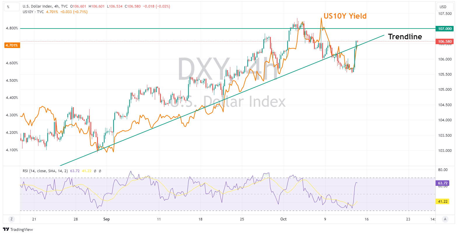 13 October 2023 By Lachlan MeakinUSD surged higher on Thursday, with DXY having its second biggest daily gain since March, reclaiming the big figure at 106 and holding above its trendline support. Hotter than expected CPI readings with the M/M rising 0.4% (exp. 0.3%) and Y/Y coming in at 3.7% , above the 3.6% consensus got the Dollar rally going, but a dismal US 30yr auction later in the session saw long end yields surging higher, further boosting the Greenback.