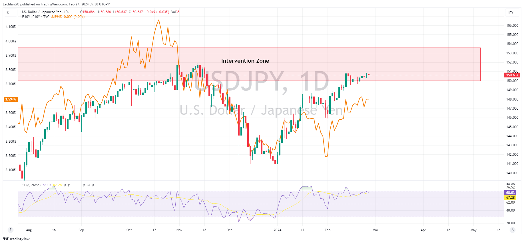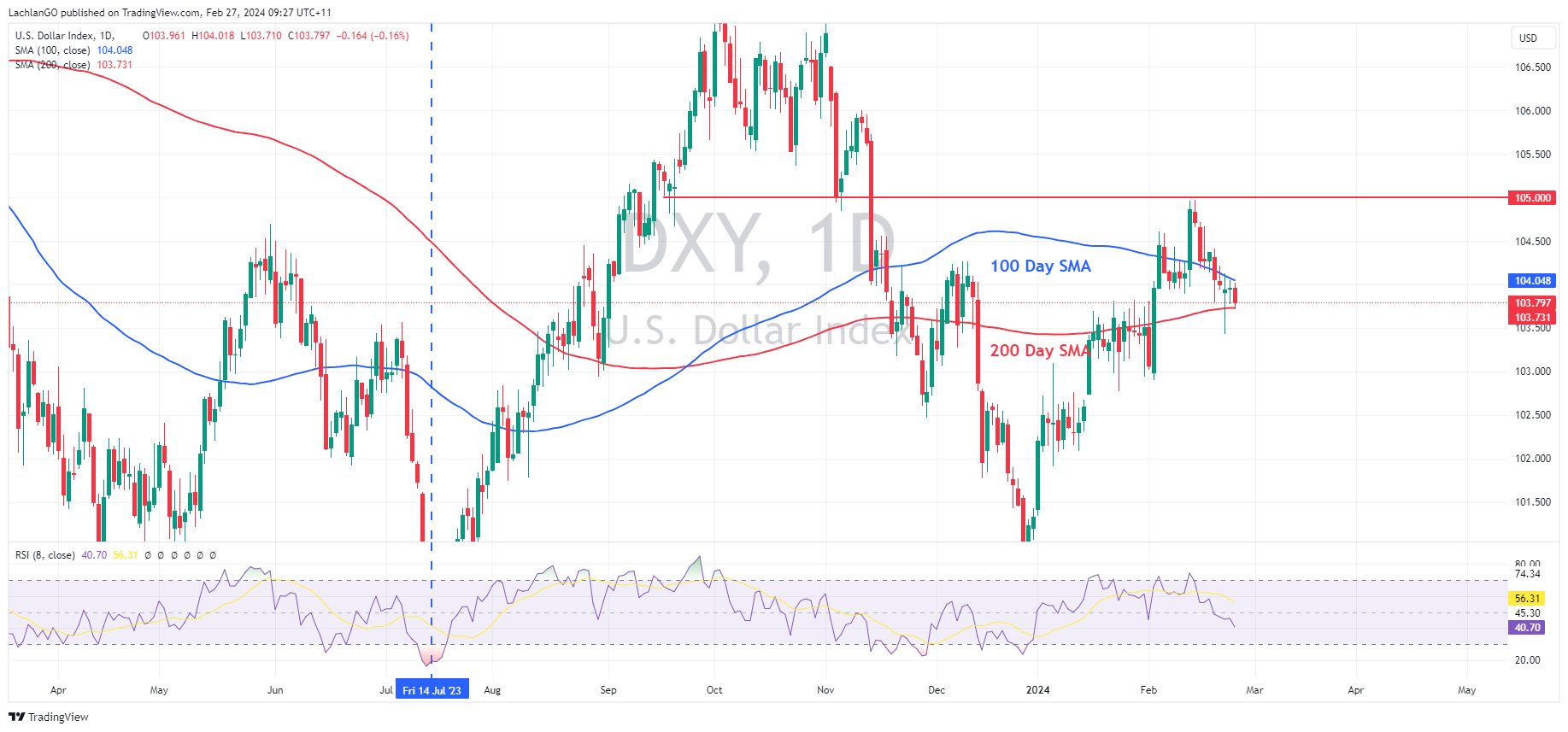 27 February 2024 By Lachlan MeakinUSD sold off on Monday with DXY failing to hold above 104 after finding some resistance at the 100 DAY SMA and dipping from a high of 104.20 to a low of 103.70 where the 200 Day SMA held as support. The move lower in USD came despite higher UST yields, which would normally support the USD.