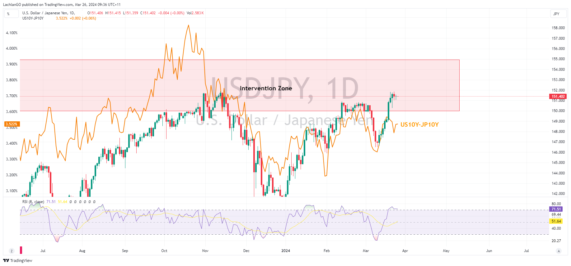 26 March 2024 By Lachlan MeakinUSD was slightly lower on Monday with DXY hitting a low of 104.140, holding above the 104 support level. News was light with only New Home Sales of any note, which missed modestly to the downside (662k vs the expected 675k). There was some Fed speak, the highlight being Fed hawk Bostic where he reiterated his desire of just one rate cut in 2024, this failed to make much impact on the Dollar though.