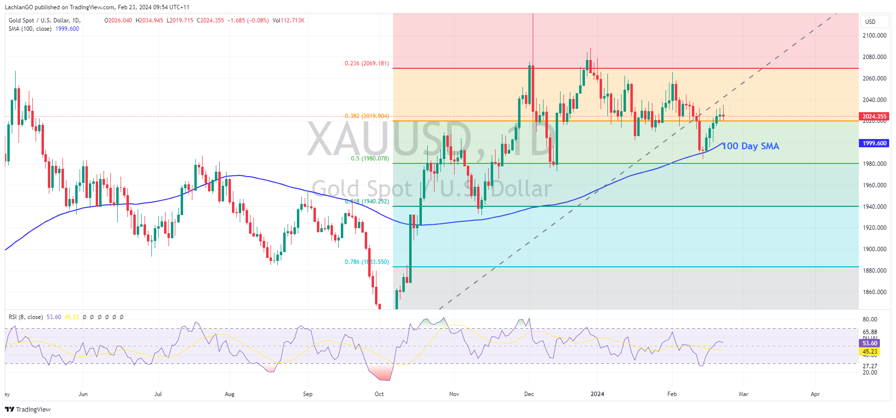 23 February 2024 By Lachlan MeakinUSD was ultimately flat in Thursdays session after a rollercoaster of a ride, DXY printed a low in the European session of 103.43 before rallying up to the 100 Day SMA at 104.10 after better than expected US Jobless claims. Flash PMIs for February were mixed with a fall in Services but a rise in Manufacturing, DXY heading into the APAC session just below the 104 level.