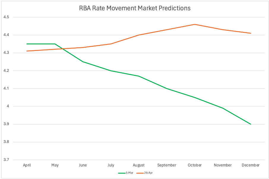 The chart depicting the change in the 30-day interbank cash rate implied yield curve from the start of March to the end of April vividly illustrates this shift. The difference is staggering.