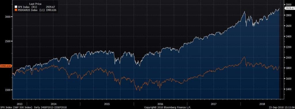 On GFC’s 10-year anniversary, one cannot help but wonder about the current dispersion in the financial markets. Developed Markets (DM) equities are now divided between US and non-US, with the US outperforming every other major market. S&P is hovering around its all-time highs whereas DM are still well below their 2018 highs.S&P 500 (White Line) Vs DM (Orange Line)