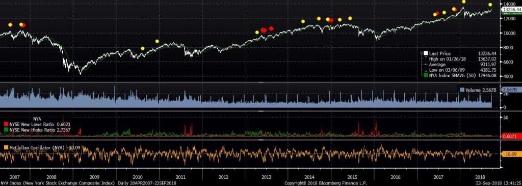 This pattern gauges indecision in the markets and is designed to predict a market correction within 40 days. The yellow dots in the chart below represents the occasions when this indicator has issued warnings.
