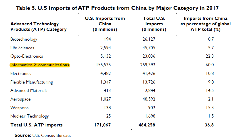 According to the U.S. Census Bureau, U.S. imports of ATP from China in 2017 totaled $171.1 billion. Information and communications products (i.e., Phones and Pads) were by far the most significant U.S. ATP import from China, accounting for 91% of U.S. ATP imports from China and 60% of U.S. global imports of this category (see table below).