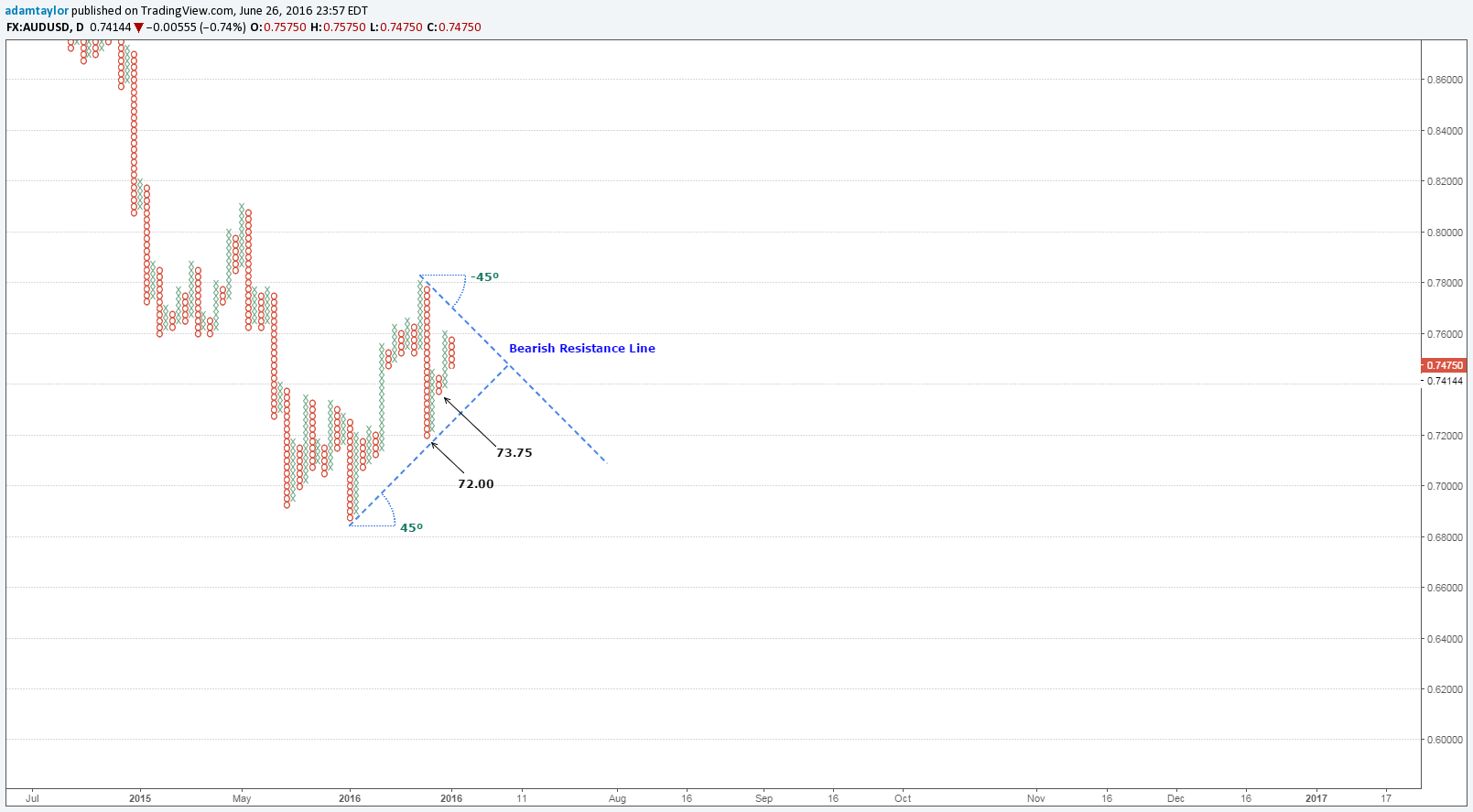 With the US Dollar gaining strength, it was inevitable that the fate of the Australian Dollar would suffer. Recent bullish moves have been slashed, replaced with the familiar sight of a bearish resistance line as shown above.