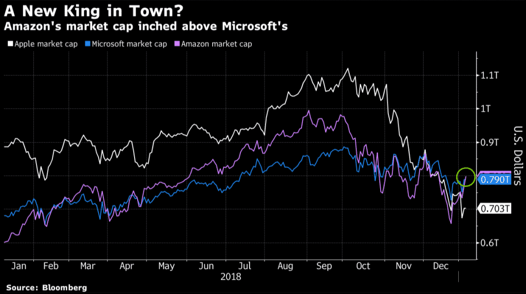 In September 2018, Amazon reached the 1 Trillion Club (please link words to this article- https://www.gomarkets.com/review-of-year-2018/) just over a month after Apple reached the same milestone. Since reaching this historic high, Amazon’s share price has dropped and dipped below the $700bn market cap in December 2018.