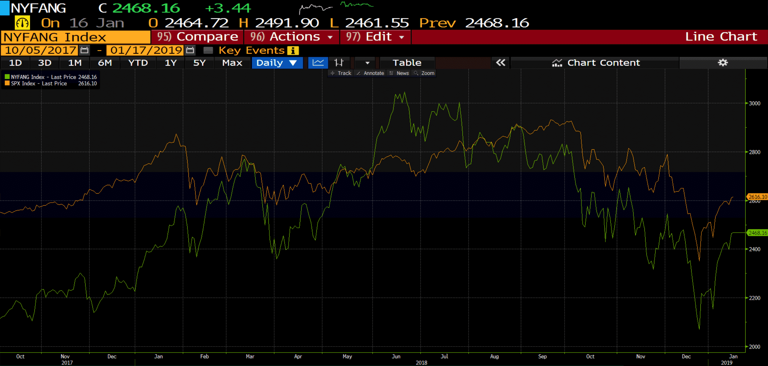 The chart above shows clearly how much sway these ‘FAANG’ stocks can have on the S&P just via the similar price action shown on the NYSE FANG Index (Green) and the S&P500 Index (Orange).