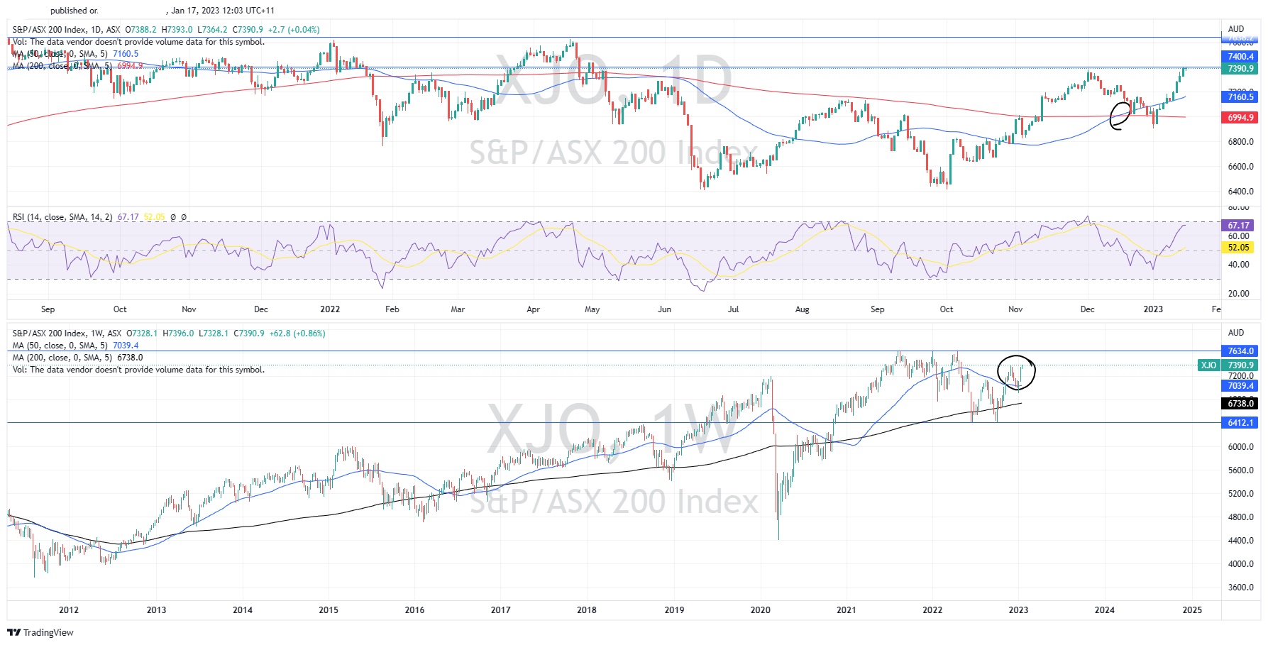 Firstly, on the weekly chart the XJO has been able to maintain a tight range over the last 2 years. Once the dust had settled after the Covid 19 pandemic the price developed a range between 6412 and 7634. The price also bounced of 6412 its long-term support twice in 2022 before pushing higher. Importantly, since October 2022, the XJO has been able to stay above the 50-week moving average as it has gained momentum.