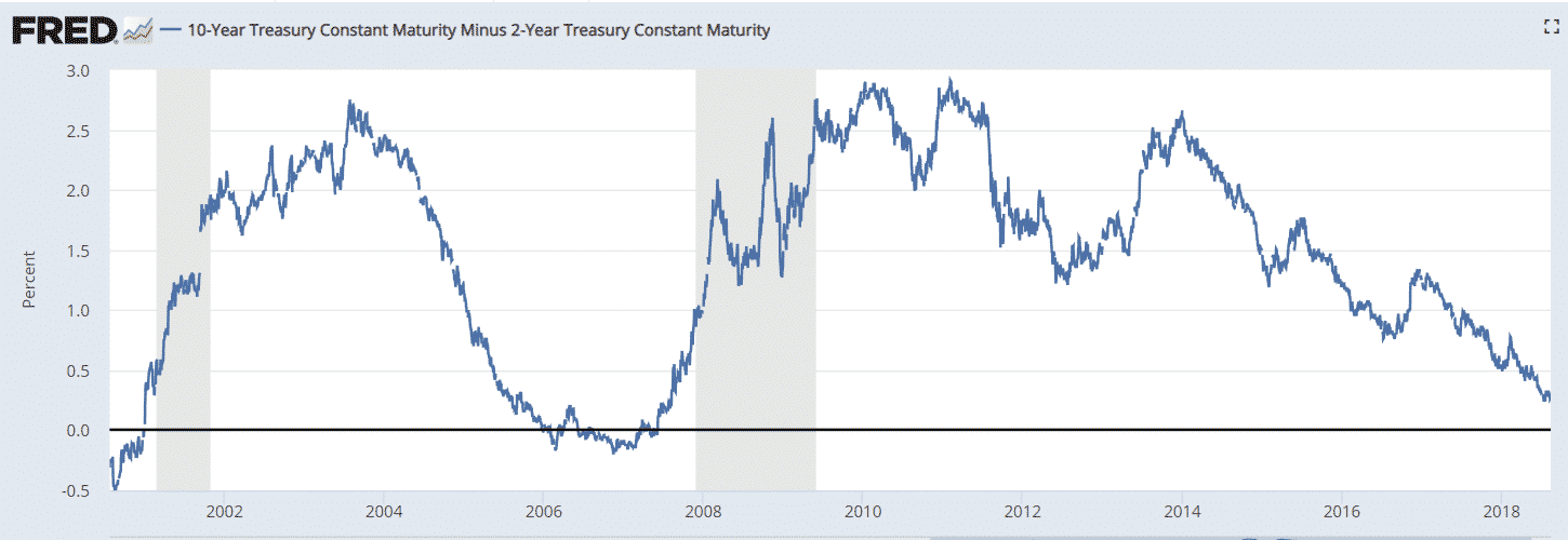 From the chart below, we can see that the current yield spread is heading towards zero. Since the Fed is guaranteed to have four rate hikes in 2018, and more increases are foreseeable in 2019, the spread is very likely to go negative sooner or later.