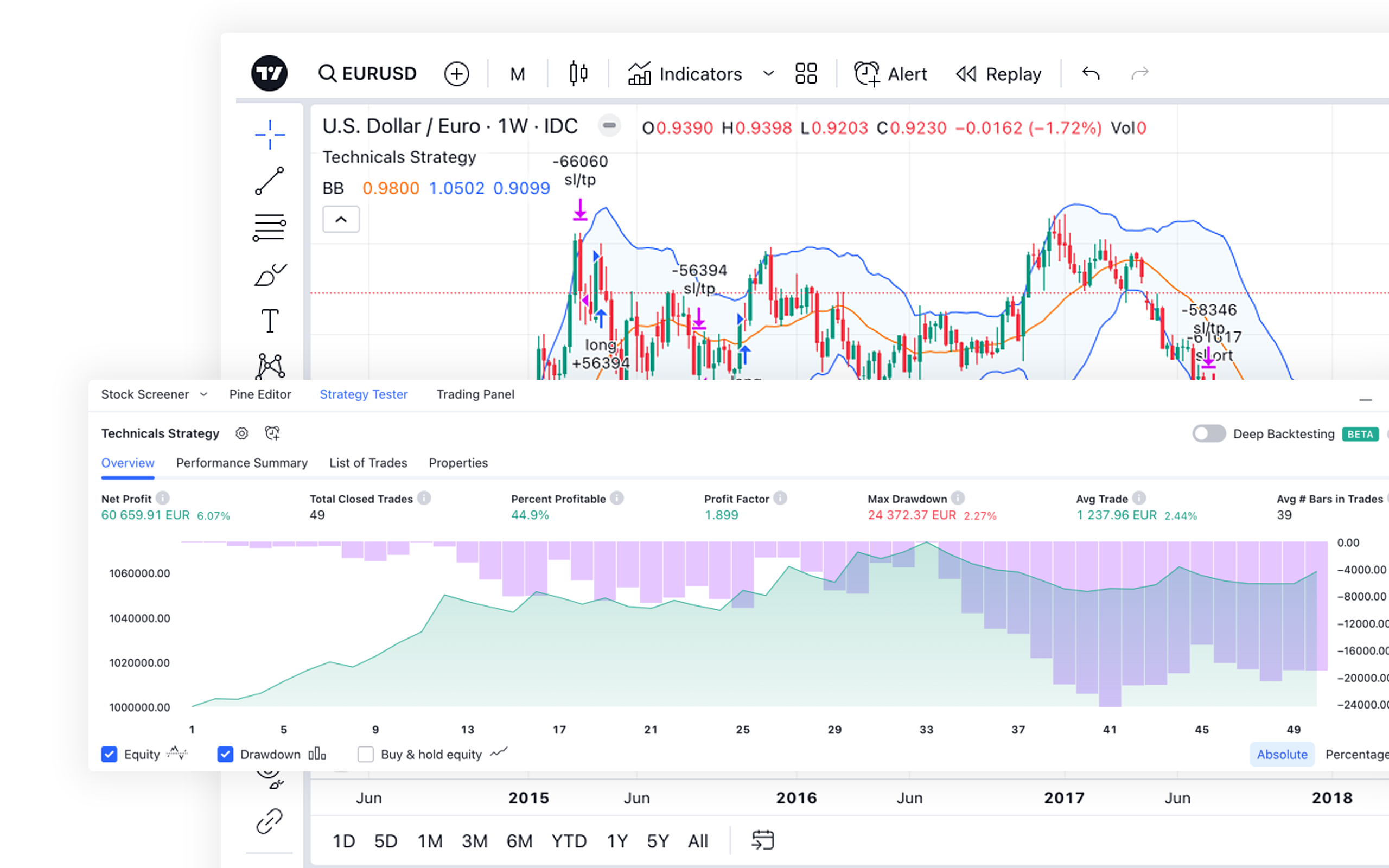 TradingView lets you simulate trades and assess the performance of your own strategies or those shared by the community.